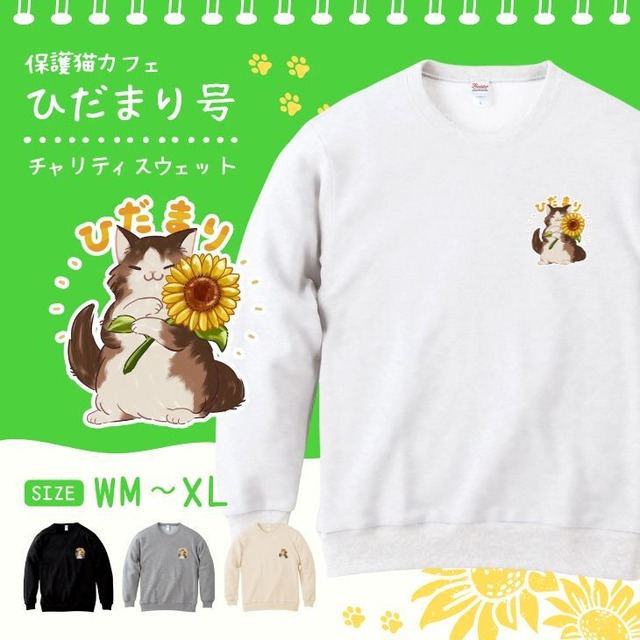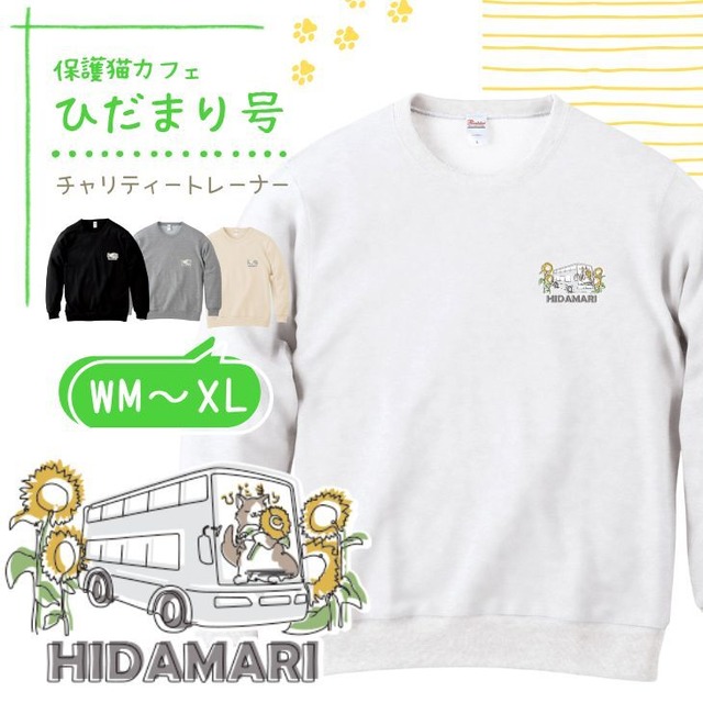 名古屋市西区の『保護猫カフェひだまり号』のチャリティートレーナーができました! 保護ネコ支援、一緒に“着て”応援しませんか? グッズを購入いただくことで保護活動支援にご参加いただけます。 ※こちらの商品の必要経費を抜いた売り上げは、保護猫の日々の食事・医療費等に寄付させていただきます。 [トレーナー詳細] 素材:綿100% ※杢グレー:綿93% ポリエステル7% 生地の重さ:285g/m2 8.4oz 生地の種類:裏毛 【ひだまり号history】 名古屋市西区にある『保護猫カフェひだまり号』は二階建バスを改装した、里親になれる猫カフェ。 可愛い猫たちがお待ちしています。ぜひ遊びにお越しください。 ひだまり活動の理念 保健センターに保護された猫たち、そして野良猫が懸命に育てた子猫たちには、それぞれに「命の期限」という現実があります。 私たちは、そんな小さな命を救い、新しい家族へとつなぐ活動をしています。 愛情いっぱいに育った猫たちは、ひだまり号の中で、たくさんの人々と出会い、触れ合います。 私たちが目指すのは、一匹でも多くの猫が、心優しい里親さんと巡り会える温かい場所(ひだまり)を提供すること。 そして、その出会いを通して、かけがえのない命が未来へとつながっていくこと。 それが、私たちの何よりの使命です。